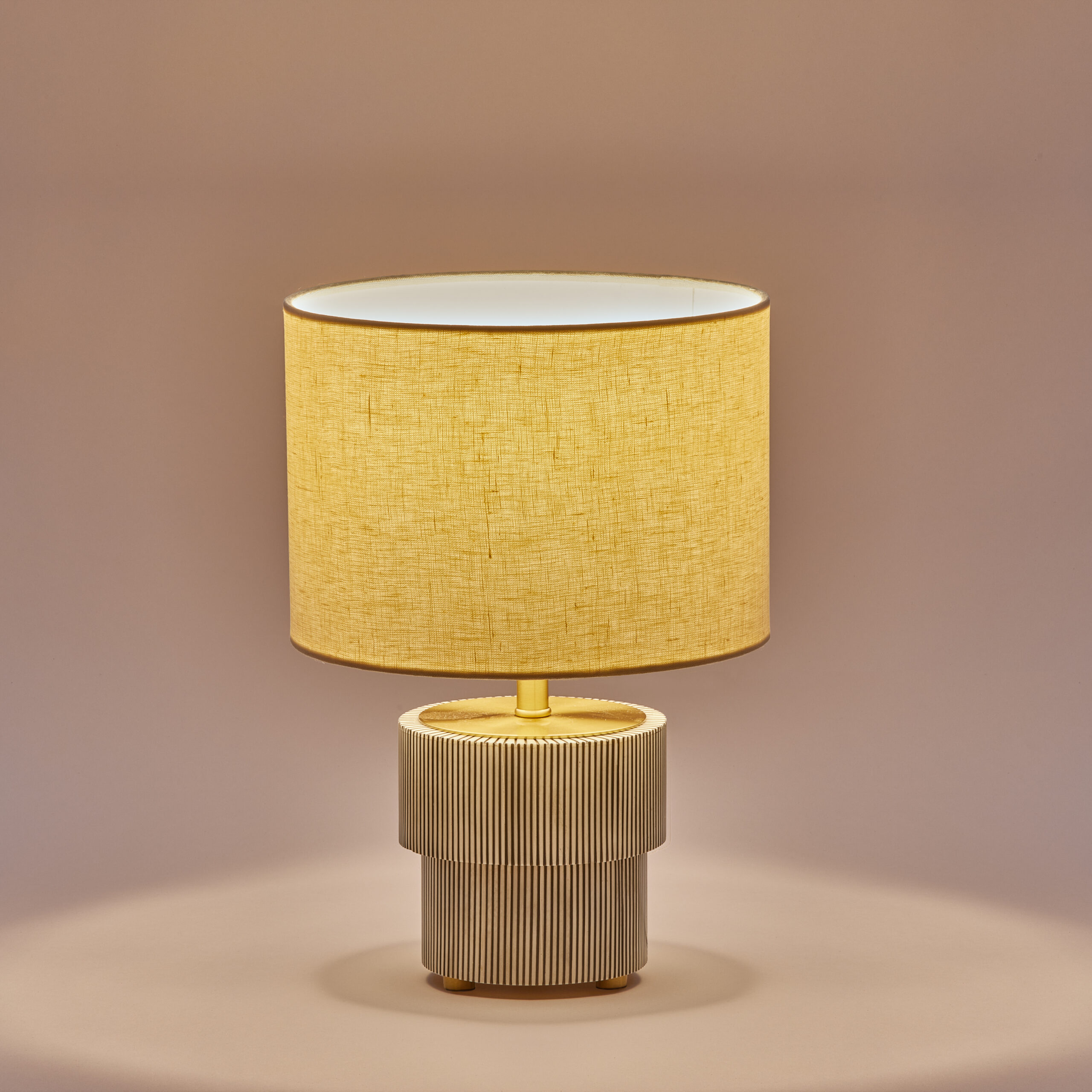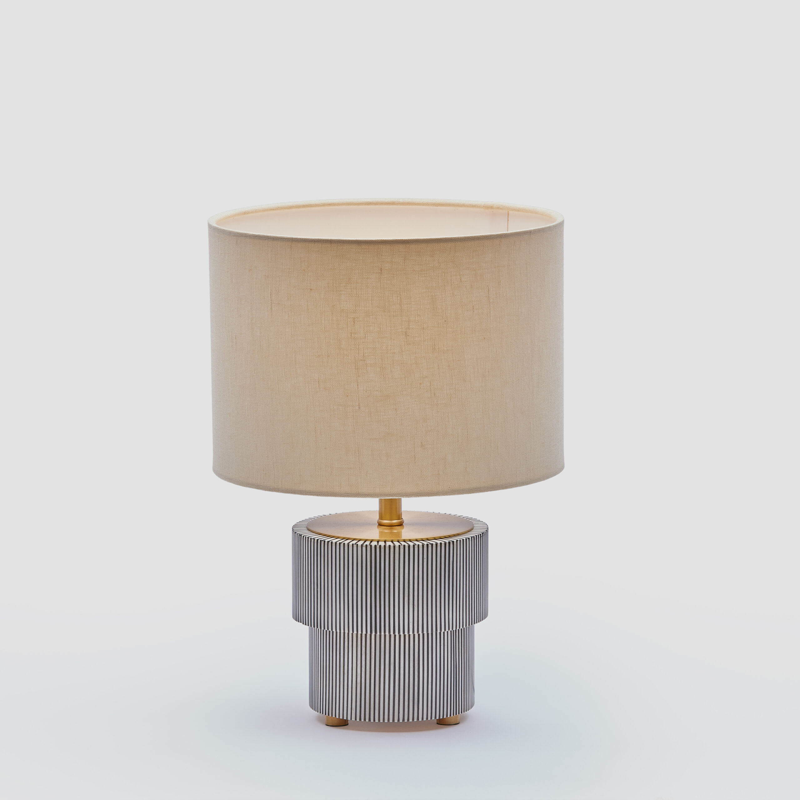 Handcrafted with horn, brass, iron, and a cream linen shade, this lamp embodies quiet sophistication. The antique brass finish and oven-baked lacquer polish enhance its artisanal charm, while the fabric shade softens the light to create an inviting ambience.